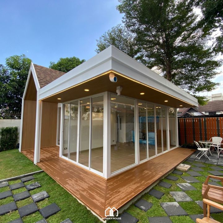 บ้านสำเร็จรูปสไตล์นอร์ดิกหลังนี้ออกแบบมาเพื่อรองรับการใช้งานของผู้อยู่อาศัยที่ต้องการพื้นที่ส่วนตัวพร้อมความสะดวกสบายในทุกวัน ฟังก์ชันภายในประกอบด้วย 1 ห้องนอน 1 ห้องน้ำ และ 1 ห้องนั่งเล่นที่จัดวางให้โปร่งโล่งด้วยงานกระจกเต็มผนัง ทำให้พื้นที่ภายในดูสว่างและถ่ายเทอากาศได้ดี ส่วนพื้นที่เฉลียงด้านหน้าออกแบบด้วยงานไม้โทนอุ่น เสริมบรรยากาศผ่อนคลายและสามารถใช้เป็นโซนนั่งพักหรือมุมทำกิจกรรมกลางแจ้งได้อย่างลงตัว