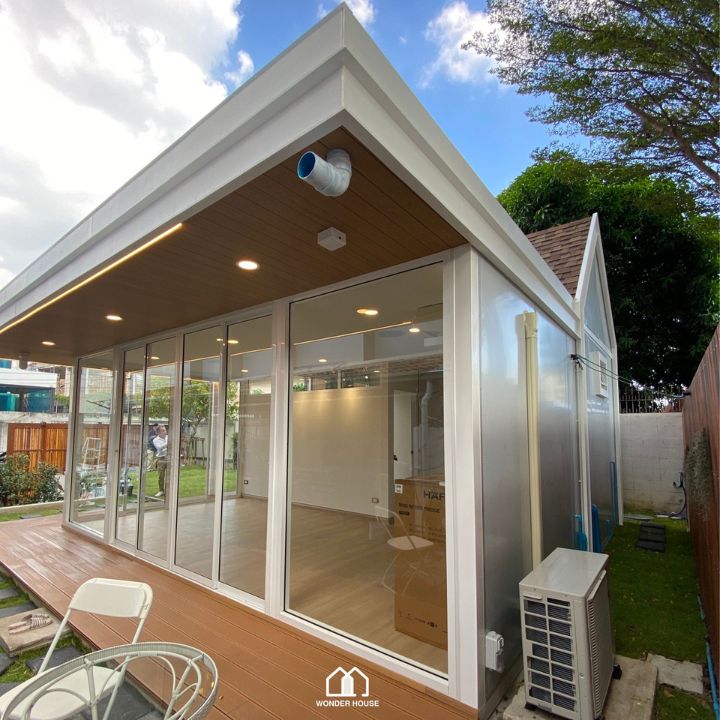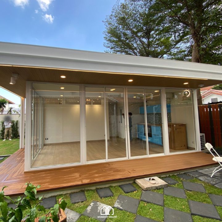 ผลงานบ้านสำเร็จรูปหลังนี้ถูกออกแบบในสไตล์นอร์ดิกที่ให้ความรู้สึกอบอุ่น เรียบง่าย และทันสมัย เหมาะสำหรับผู้ที่ต้องการบ้านสำเร็จรูปที่ฟังก์ชันครบ ใช้งานได้จริง และมีดีไซน์โดดเด่นเหนือบ้านทั่วไป จุดเด่นของบ้านหลังนี้อยู่ที่โครงสร้างหลังคาจั่วสูง การใช้ผนังกระจกเต็มบานเพื่อรับแสงธรรมชาติ และการเลือกวัสดุลายไม้ที่ช่วยเพิ่มบรรยากาศเป็นกันเอง ทีมงาน Wonder House ใช้ระบบบ้านโครงสร้างเหล็กที่มีความแข็งแรงและก่อสร้างได้รวดเร็ว ทำให้บ้านสำเร็จรูปหลังนี้ตอบโจทย์ทั้งความสวยงามและความทนทานในระยะยาว