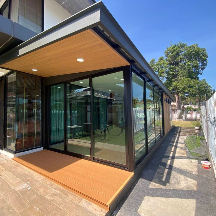ผลงานบ้านสำเร็จรูปหลังนี้ถูกออกแบบในสไตล์โมเดิร์นที่ตอบโจทย์ผู้ที่ต้องการออฟฟิศสำเร็จรูปหรือ Home Office ที่ใช้งานได้จริงในพื้นที่จำกัด ดีไซน์เน้นเส้นสายทันสมัย ผสานผนังกระจกเต็มบานเพื่อรับแสงธรรมชาติ เสริมความโปร่งโล่ง และทำให้พื้นที่ภายในเชื่อมต่อกับสวนด้านนอกอย่างลงตัว ทีมงาน Wonder House เลือกใช้ระบบบ้านโครงสร้างเหล็กที่ช่วยเพิ่มความแข็งแรง ทนทานต่อสภาพอากาศ และควบคุมคุณภาพการก่อสร้างได้อย่างแม่นยำตามมาตรฐานโรงงาน เหมาะสำหรับผู้ประกอบการที่ต้องการออฟฟิศสำเร็จรูปที่ติดตั้งเร็วและพร้อมใช้งานทันที